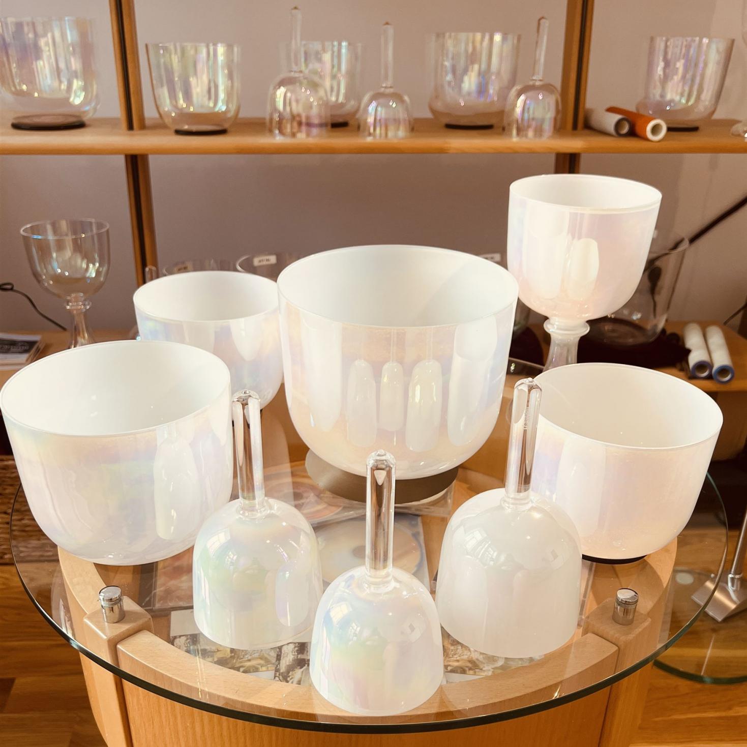 Diese Kristallklangschalen sind gerade eben eingetroffen und freuen sich auf eine Heimat.